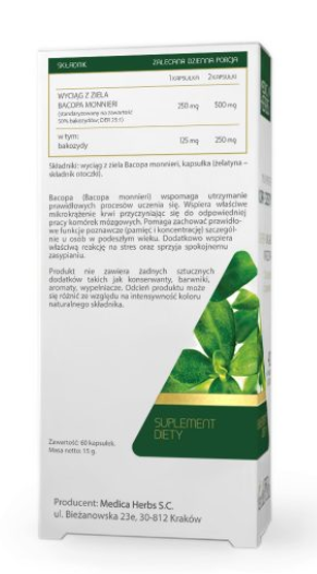 Składniki: wyciąg z ziela Bacopa monnieri, kapsułka (żelatyna – składnik otoczki).