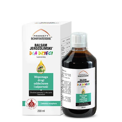 BALSAM JEROZOLIMSKI® DLA DZIECI zawiera starannie dobraną kompozycję ziół stworzoną według zakonnej receptury Zakonu Bonifratrów, w trosce o prawidłowe funkcjonowanie układu oddechowego i odpornościowego. Składniki zawarte w preparacie wspierają właściwe funkcjonowanie układu oddechowego i odpornościowego, łagodzą podrażnione gardło, krtań oraz struny głosowe, ułatwiając odksztuszanie.